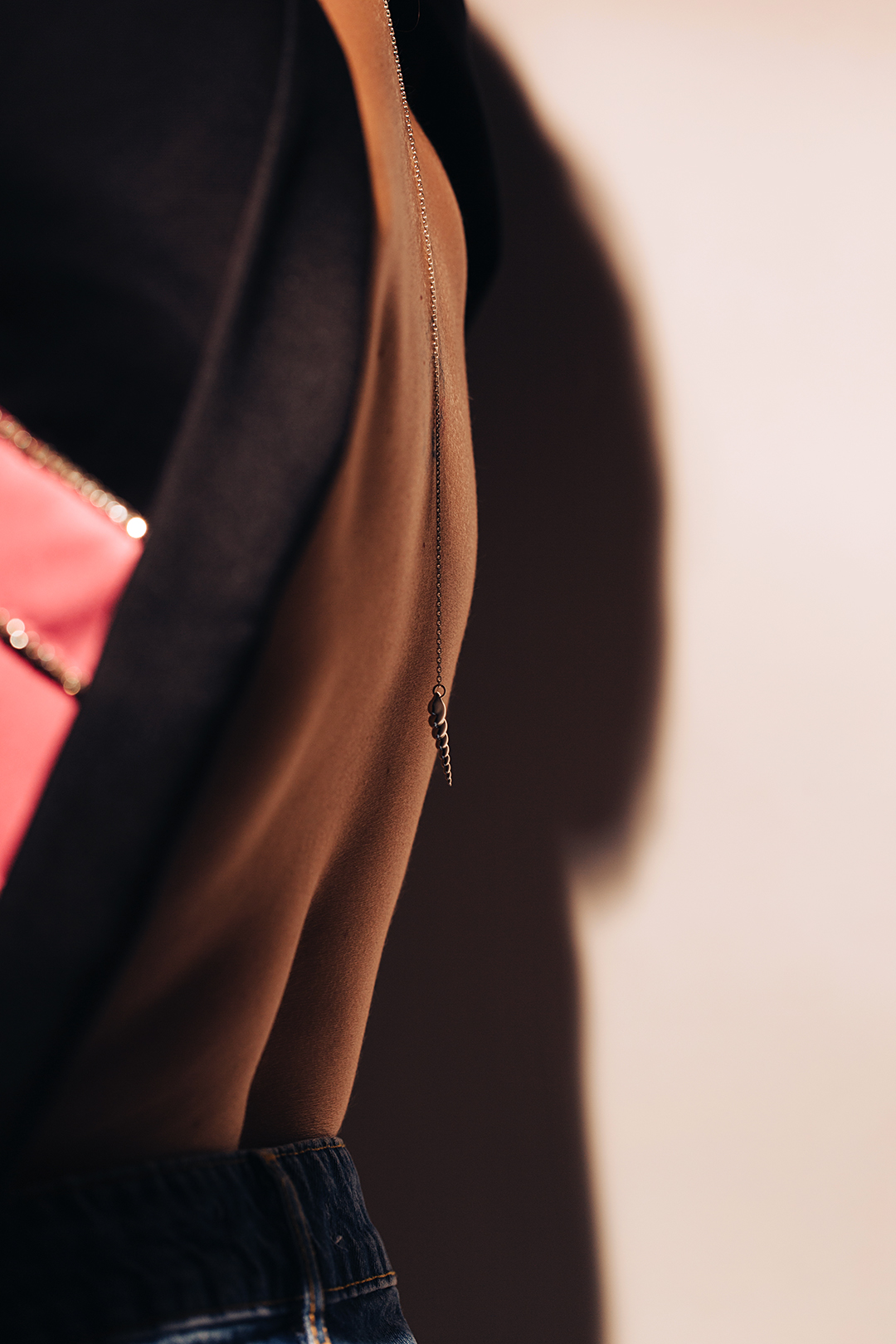 До якірного ланцюжка зі срібла в базовій довжині 55 сантиметрів прикріплена блискуча черепашка виду Clathrus turtonis. Носи як кольє-краватку, або як сотуар та прикрашай спину.